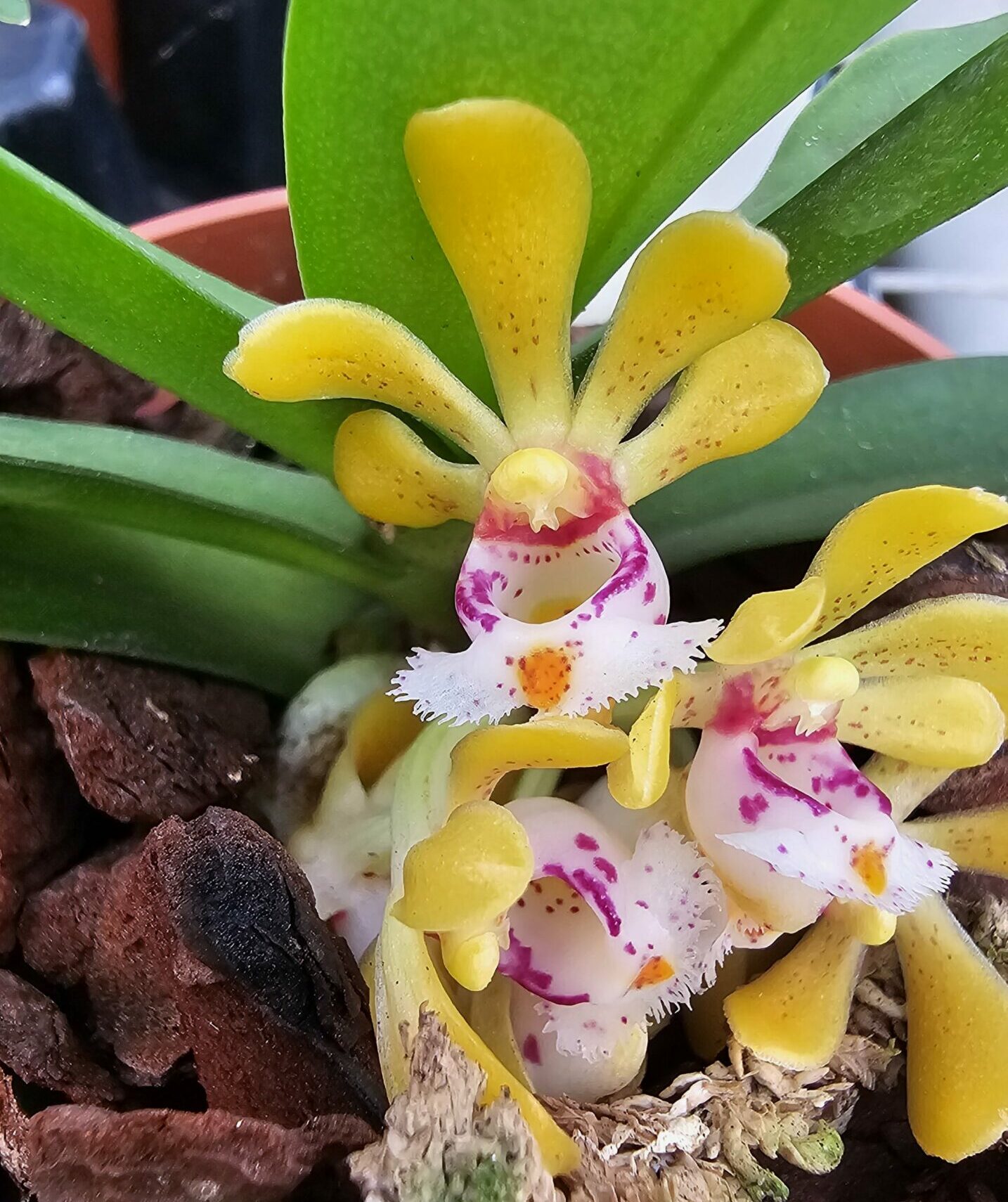 Gastrochilus obliquus est une orchidée miniature. Son aire de répartition est vaste de l’ Inde, au Népal, la Chine, la Thaïlande au Myanmar dans des forêts denses à des altitudes de 800 à 1400 mètres. Epiphyte poussant sur les troncs et branches des arbres. Ses fleurs s’épanouissent en grappes courtes de couleurs jaunes au blanc vert tachetées de brun rouge .